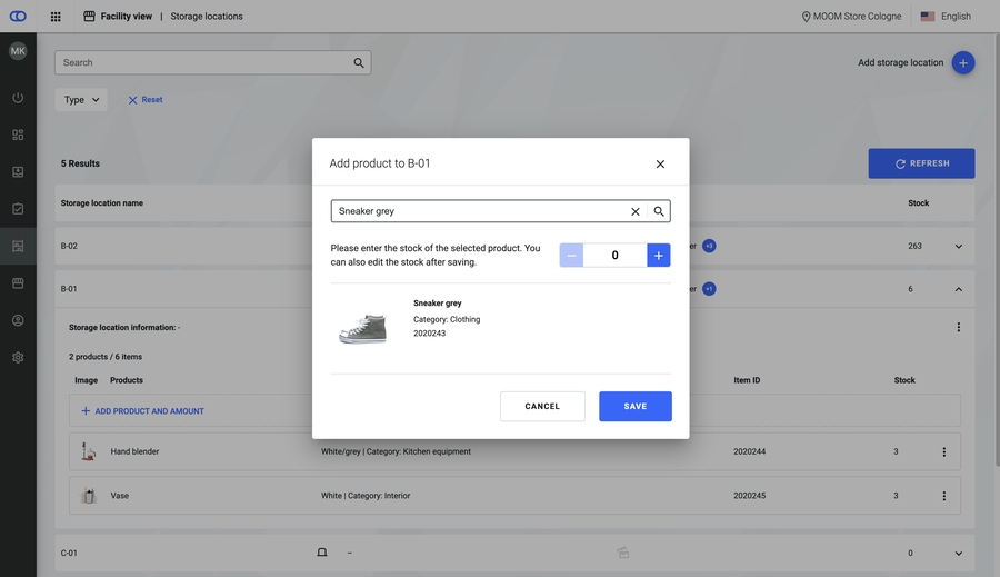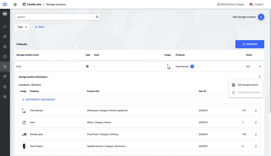 The storage location cards can be expanded to show more detailed information of all products situated on the respective location such as item ID or product image.