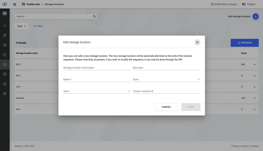 Zone: Value describing the zone in which the storage location is located. The user can define several zones via API, for example, picking area or inbound area. The zone can be chosen when creating a storage location but cannot be changed afterwards in this view.