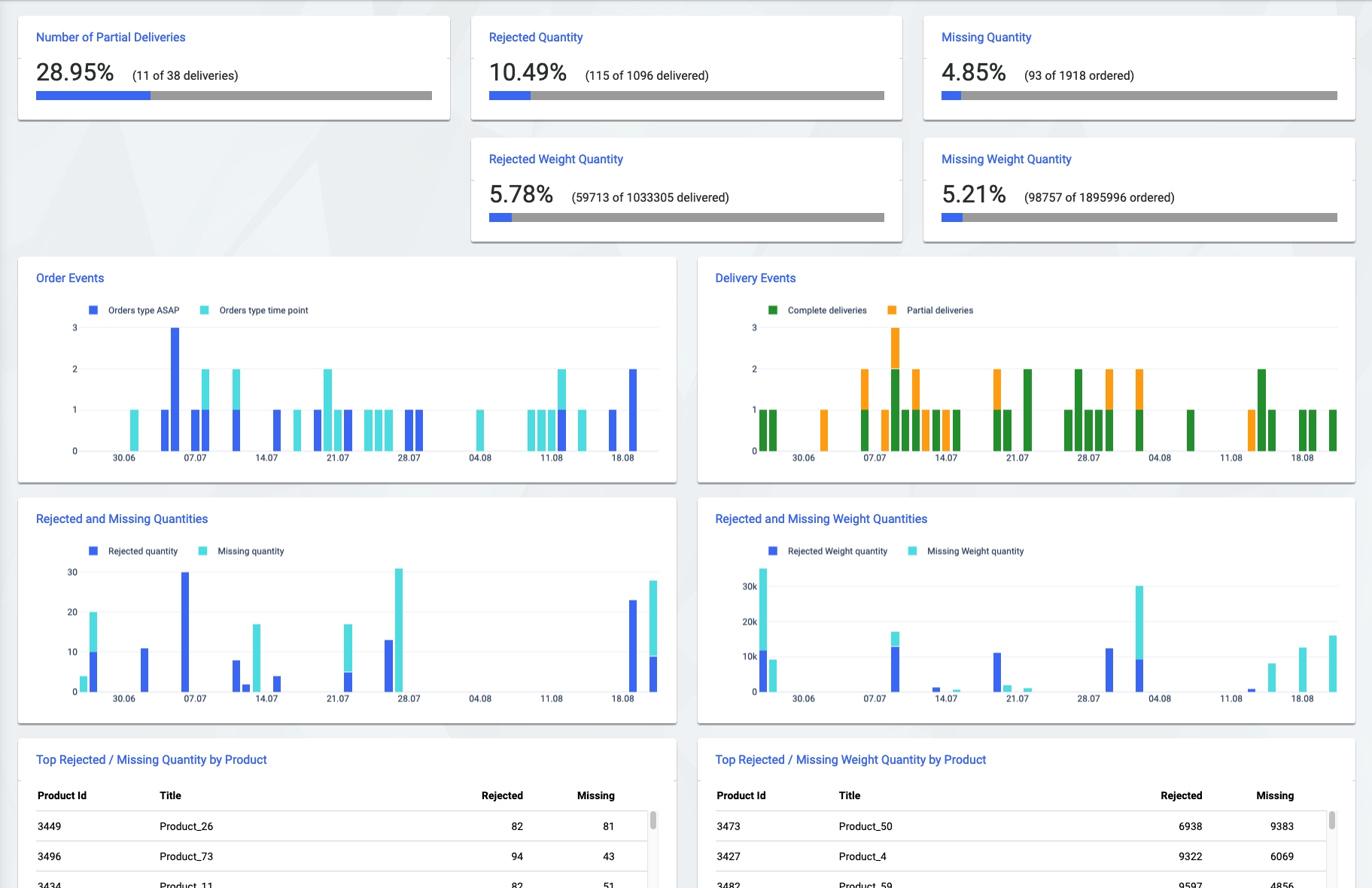 The figures mentioned are displayed in various ways on this page: by delivery date, by product and in total. Rejected and missing quantities are listed separately depending on whether the items have a unit of weight or not. In the following chart, it can be seen that for deliveries on August 18, the quantity of 9 was rejected and the quantity of 19 was missing.