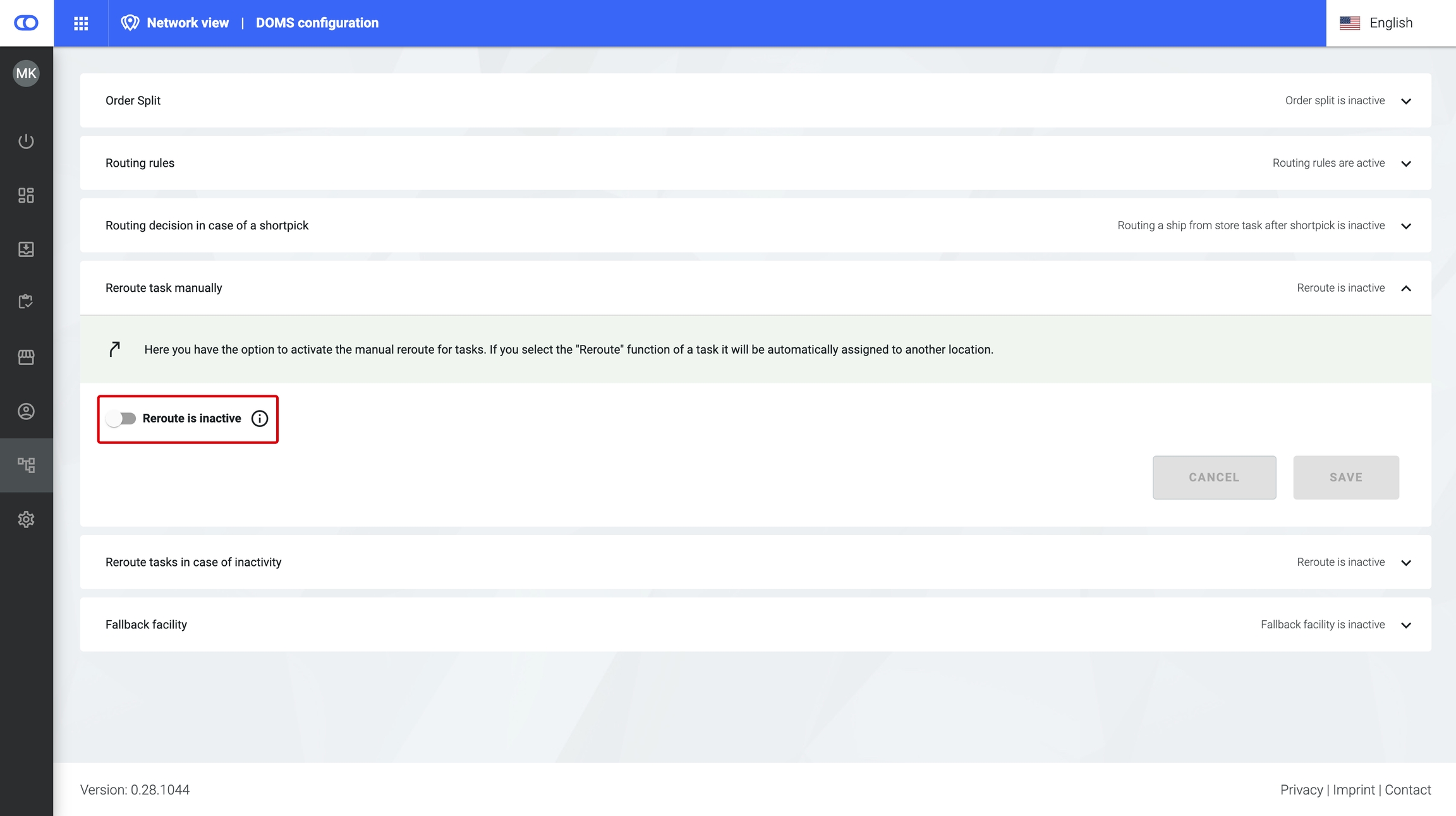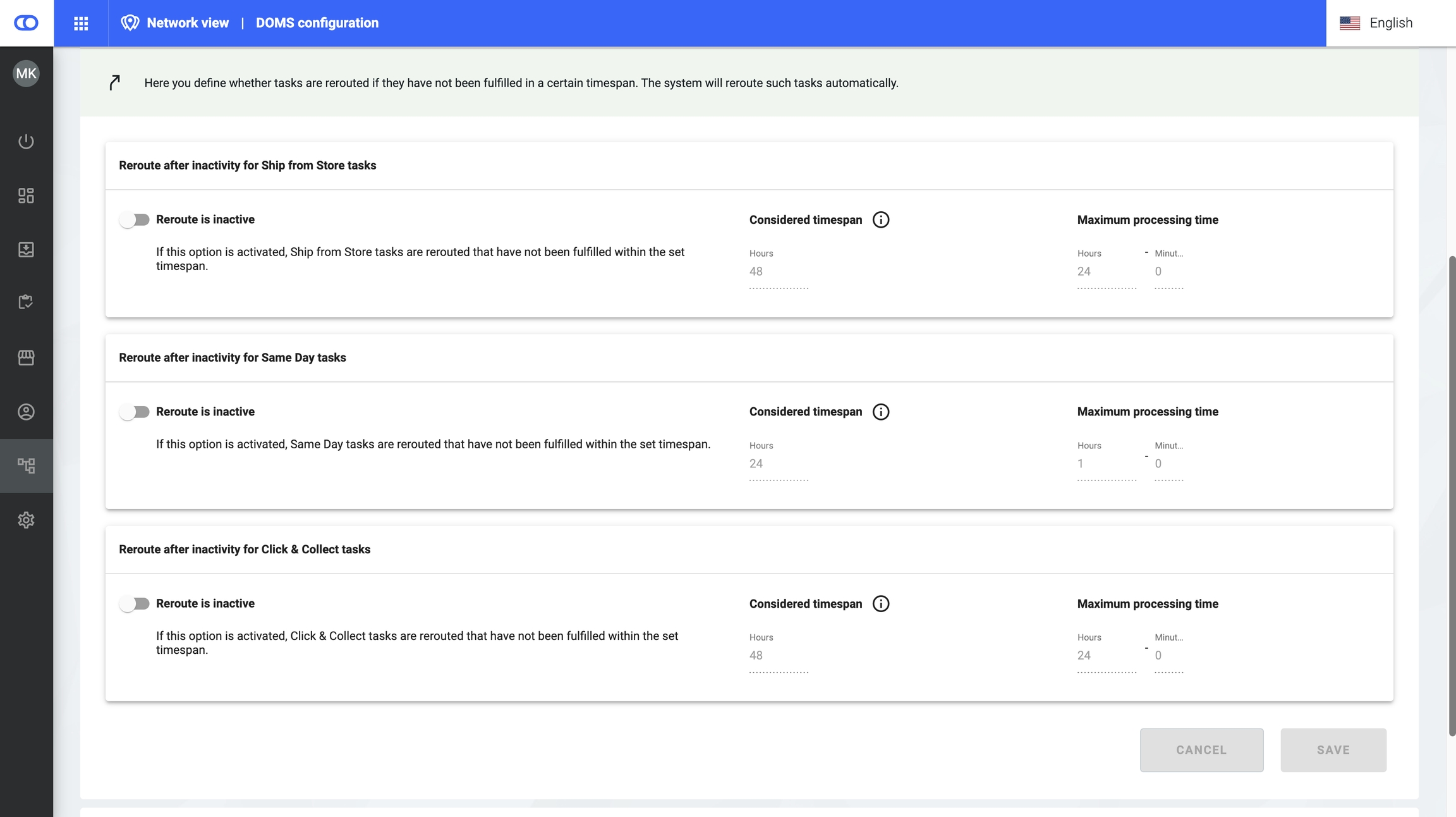 It is possible that an order could not be assigned to a facility ("routed"), because all available facilities do not pass a specific fence. In such a case, routing the order is retried whenever another order is passed to the DOMS. After a configurable amount of time, such an order is set to a “not_routable” state. The default is set to 8 hours.
