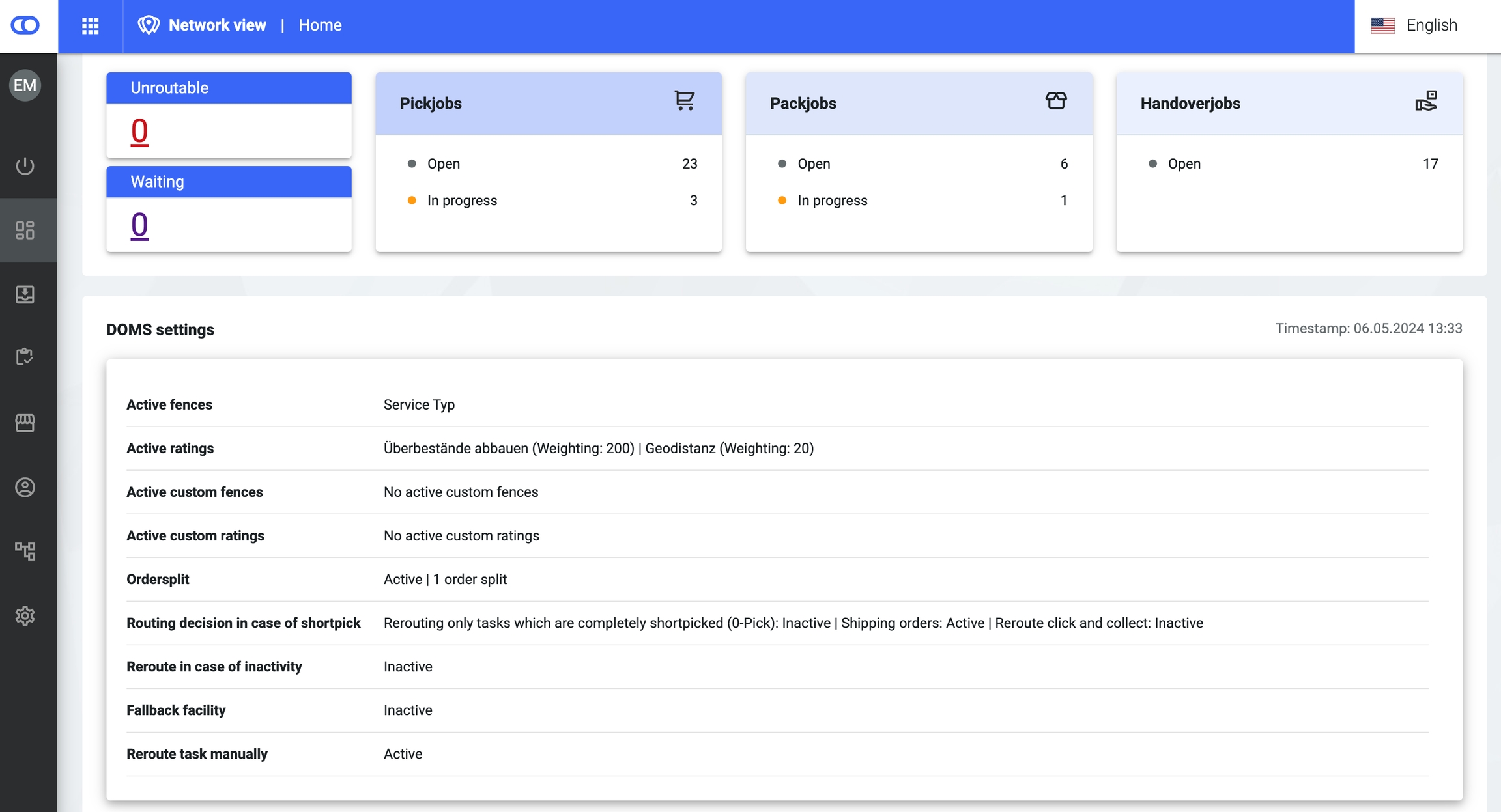 The home view serves as a cockpit which provides the user with all important operational data at a glance. In this way, processes where the user needs to take action or which require special attention can be quickly identified. This covers, among others, the status of pick jobs, pack jobs and handover jobs or the amount of unroutable and waiting orders. Furthermore all currently configured DOMS settings can be found here.