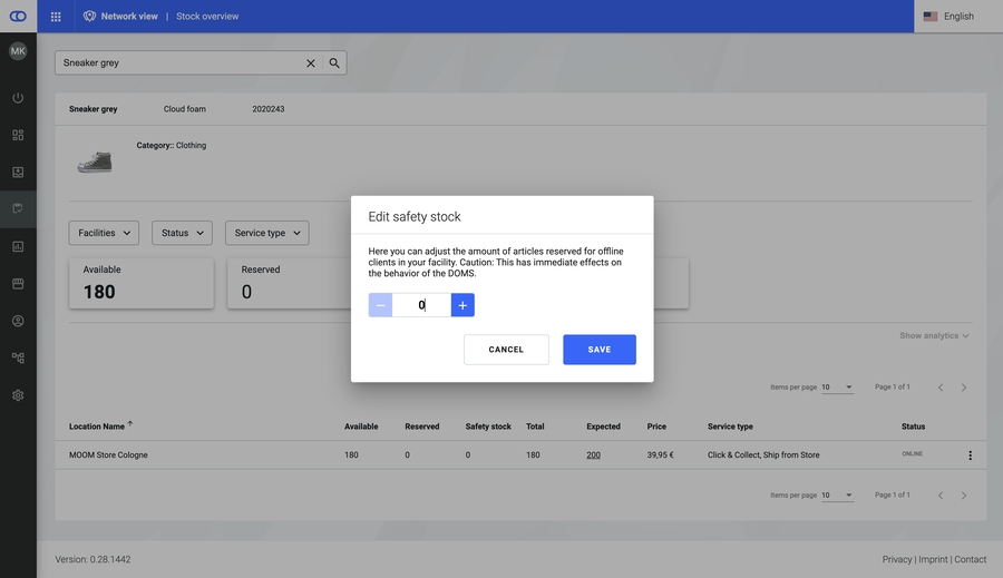 Safety Stock: Stock that is held back for offline sales. Safety stock can be configured on the stock detail view by clicking on the three-dot menu on the right. For more information, please refer to Safety Stock.