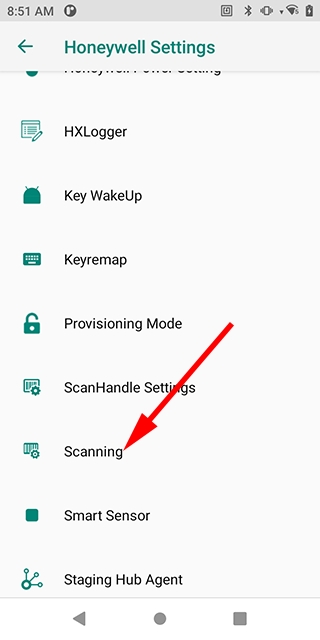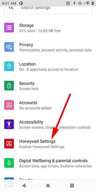 Open the Android device settings and select "Honeywell Settings".