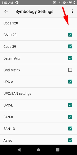 Select the barcode types you want to support.