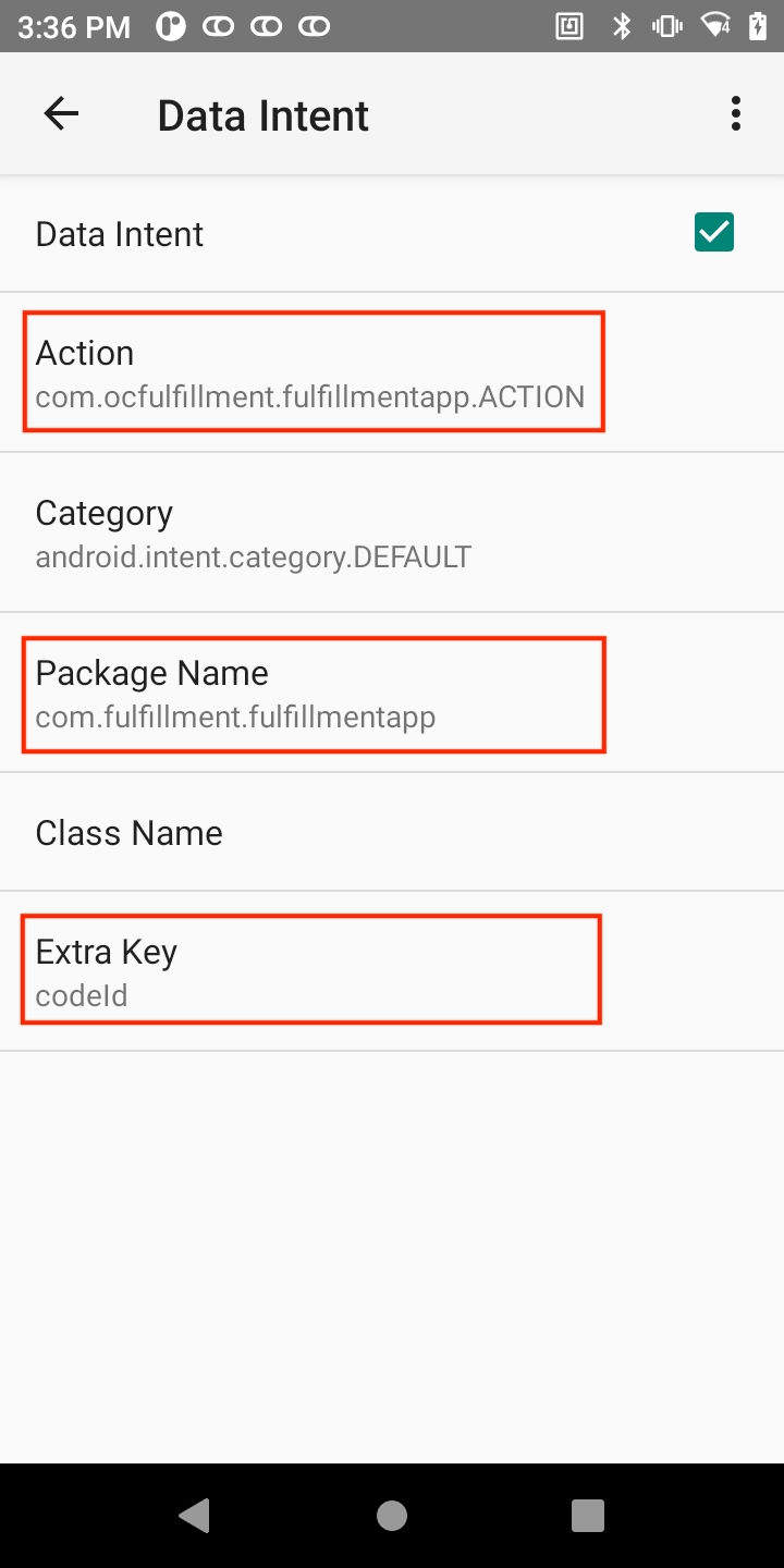 Make sure the following information for "Action", "Package Name" and "Extra Key" is entered
