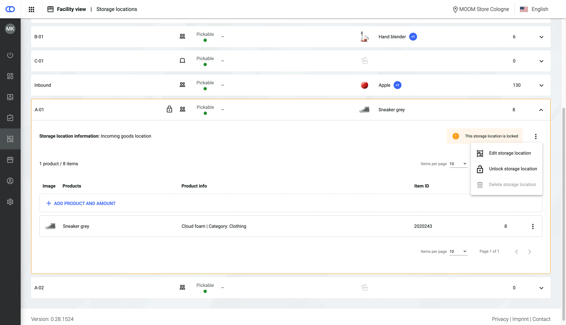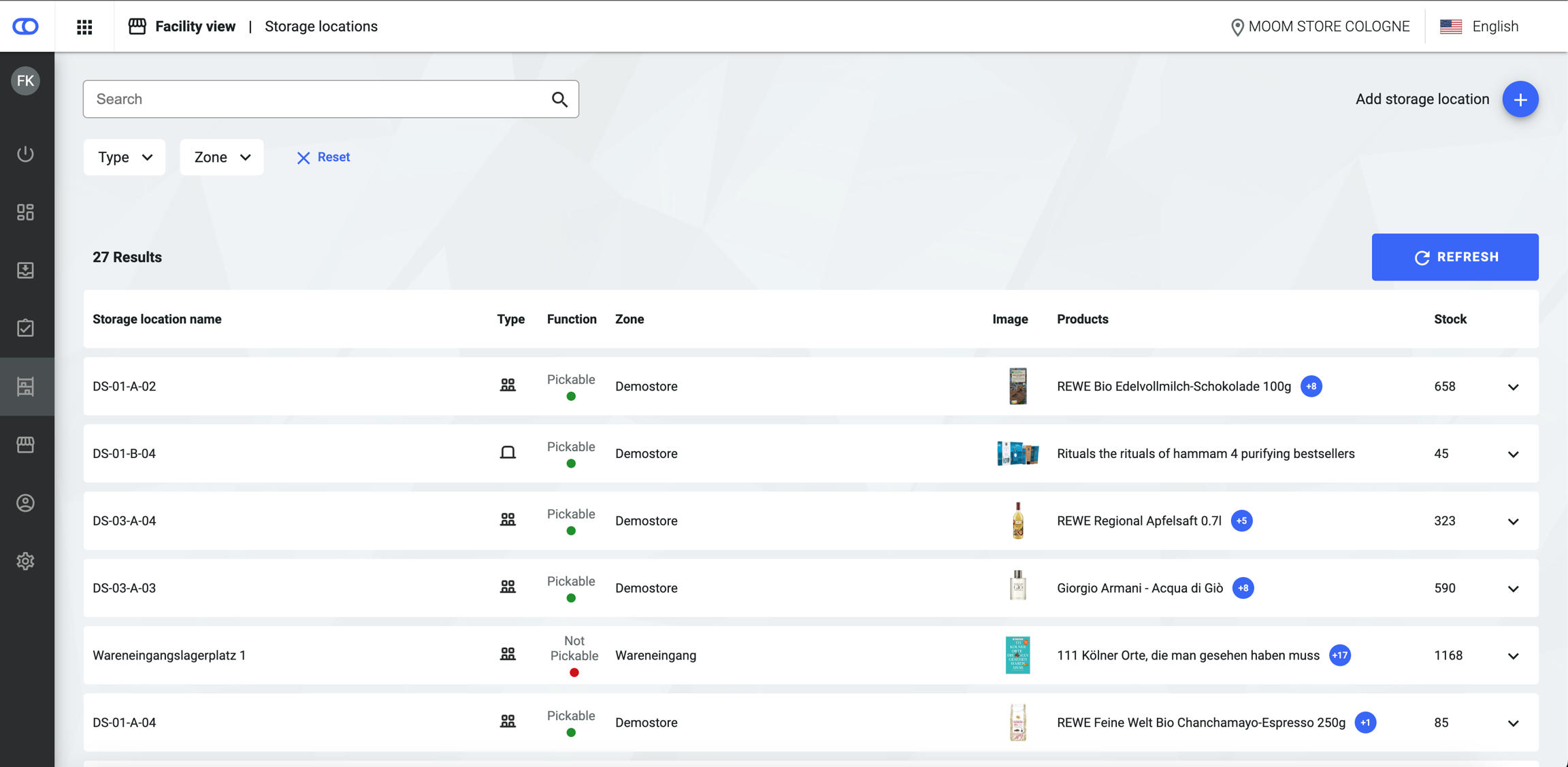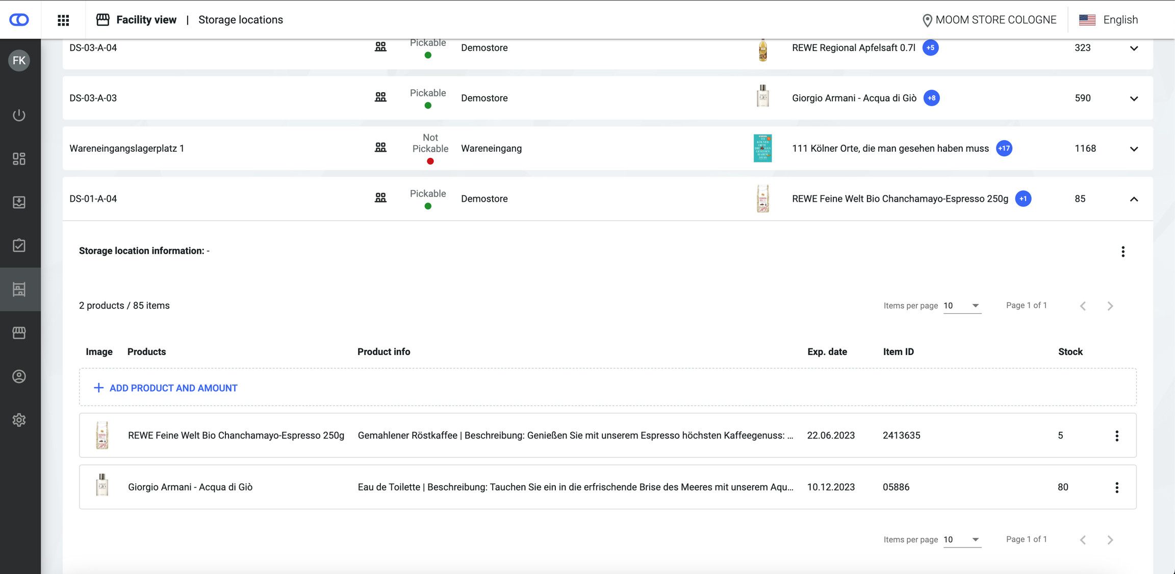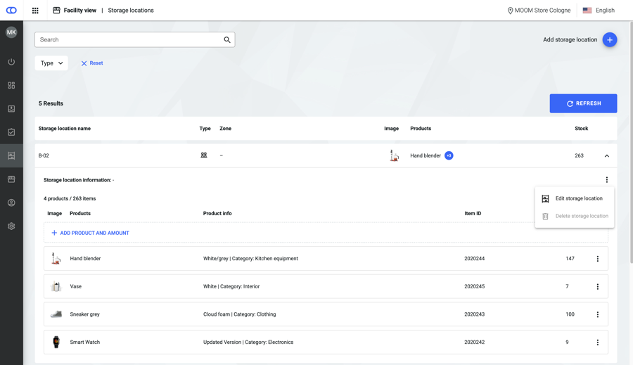 Users can expand the storage location cards to show more detailed information for all products on the respective location, such as item ID or a product image.