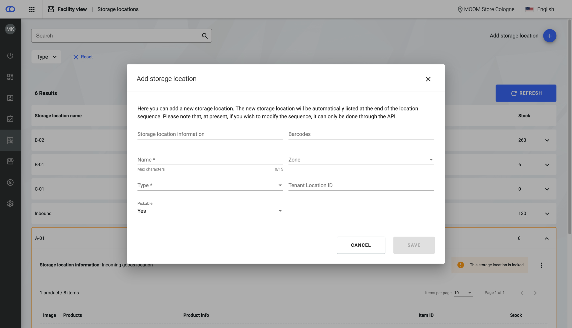 The storage location view shows all storage locations of a facility, the items placed on them, and other related information. In addition, users can perform actions such as locking a storage location or marking it as pickable or non-pickable.