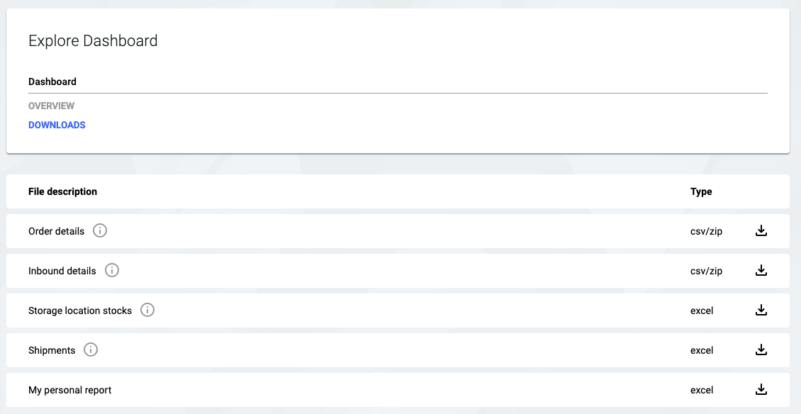 On this page, users can download various reports and data extracts as CSV or Excel files. These downloads are enabled on an individual basis. Contact support to inquire about available reports.