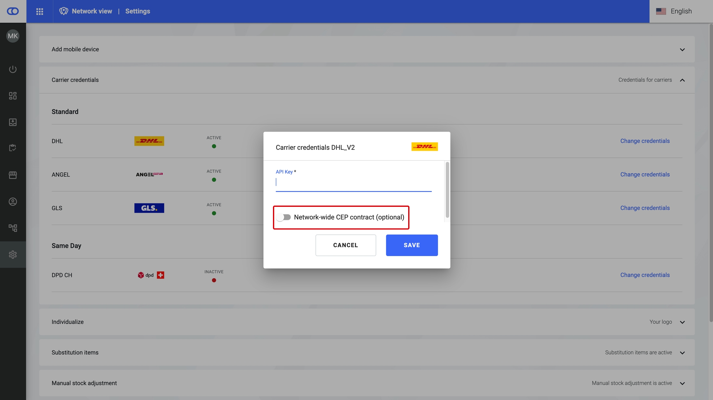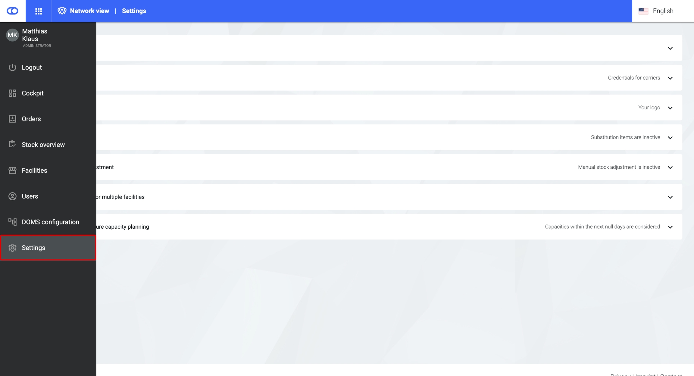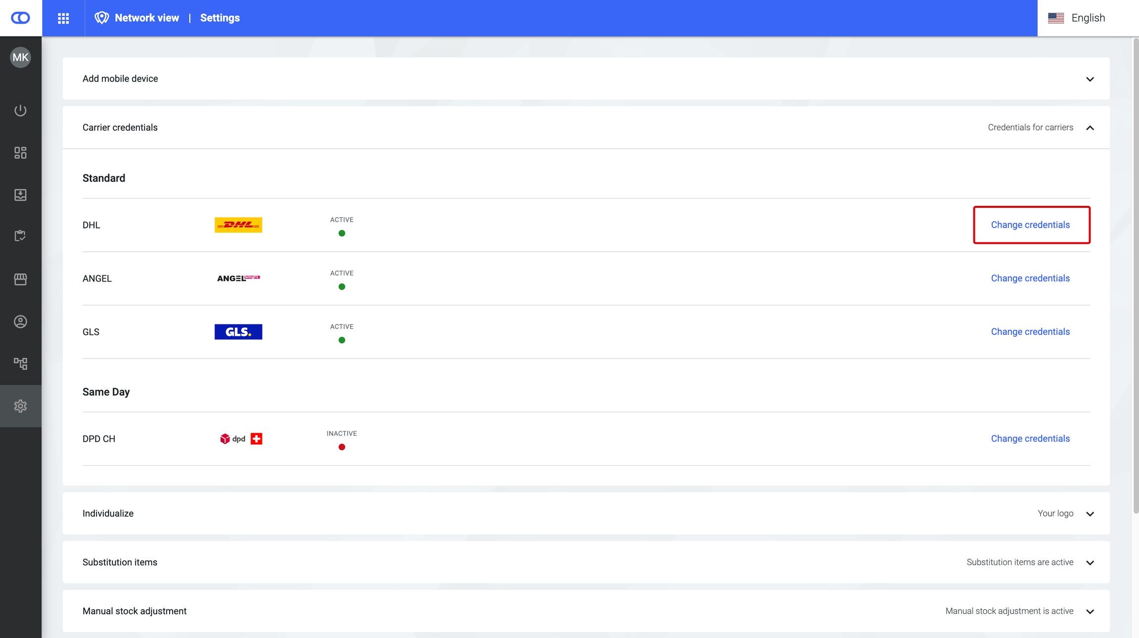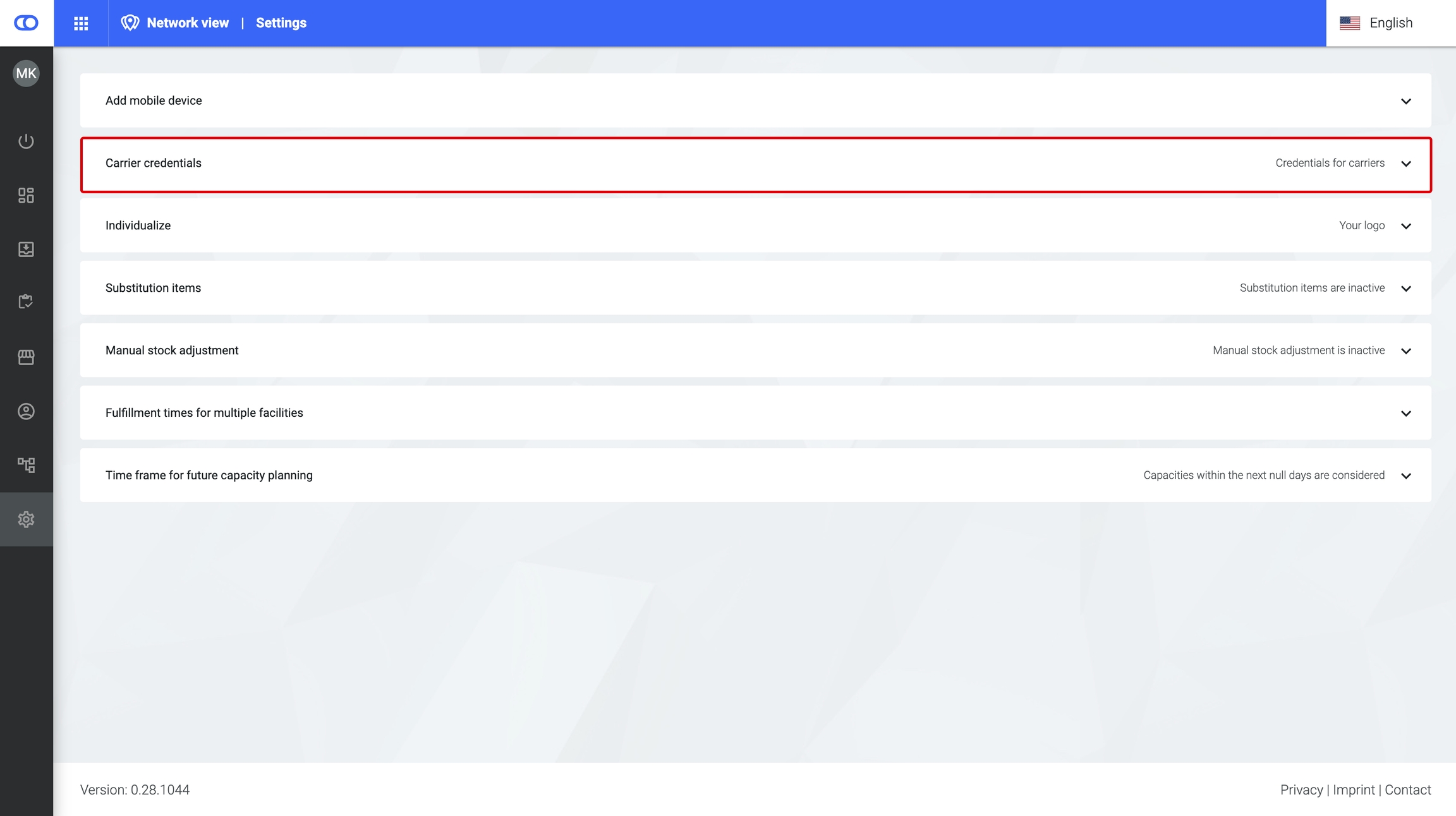 This provides an overview of all connected carriers for the tenant. Furthermore, users can define carrier credentials tenant-wide. Location-based carrier credentials can be configured in the Facilities section under Carrier.