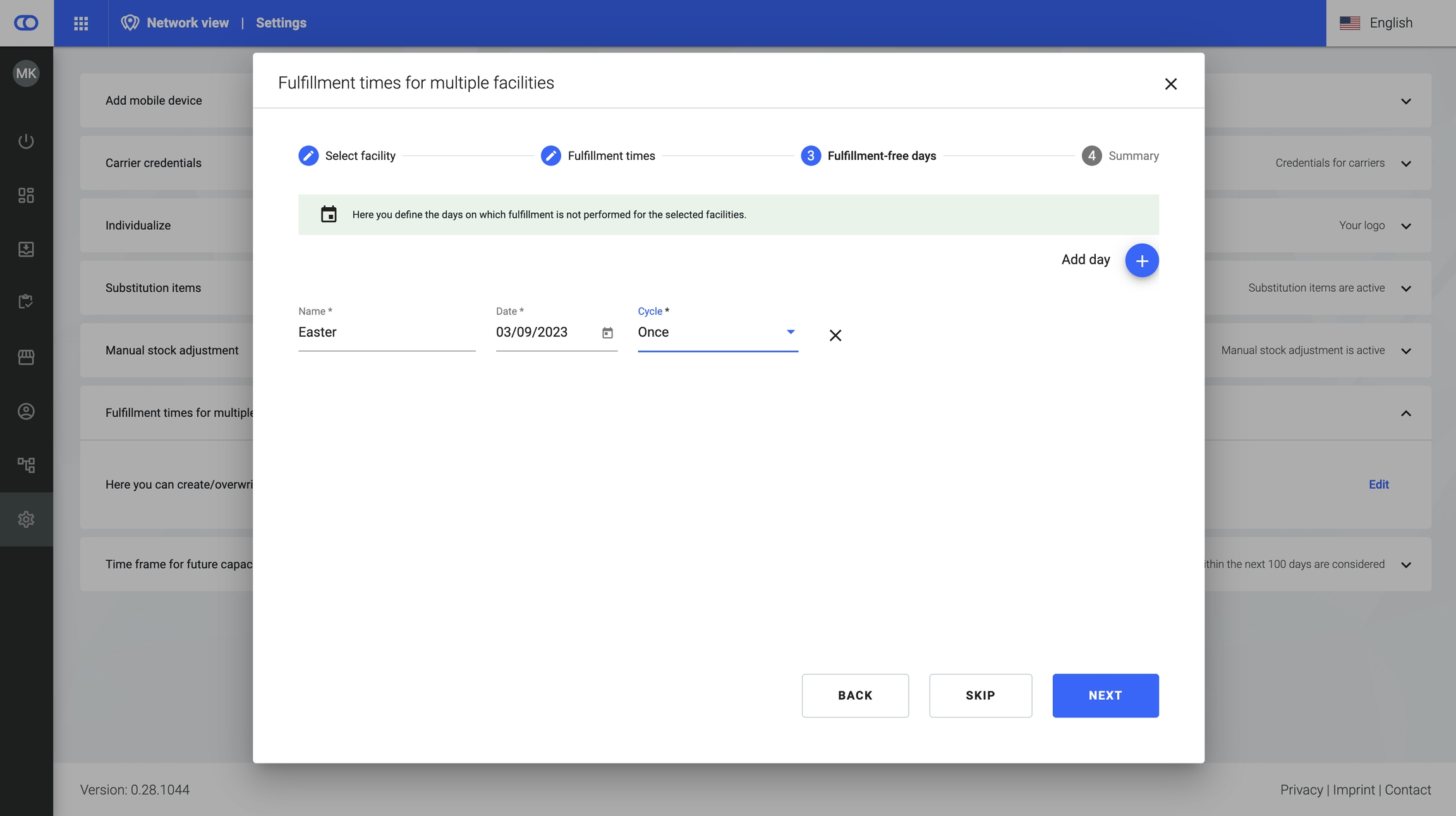 Optional: Set fulfillment free days in batch for holidays, cycle counting, or other fixed dates.
