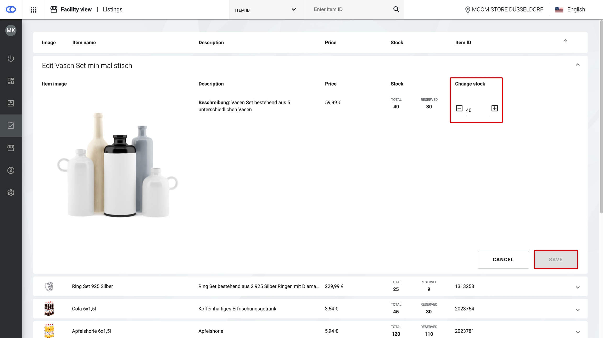 In the facility view, it is then possible to change the stock manually in the listings. After changing, click Save