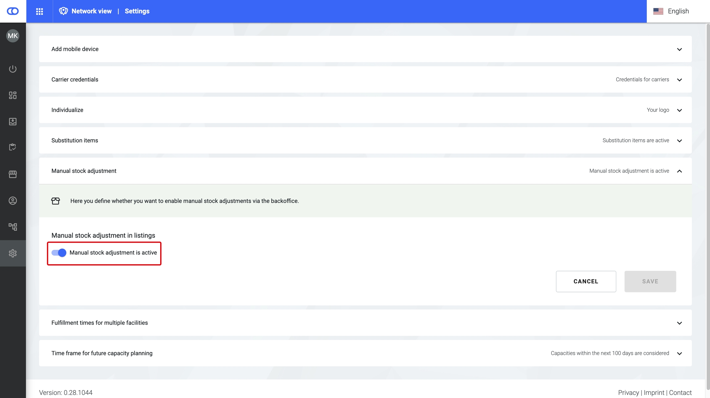 Enable the function by toggling the switch from Manual stock adjustment is inactive to Manual stock adjustment is active, then click Save