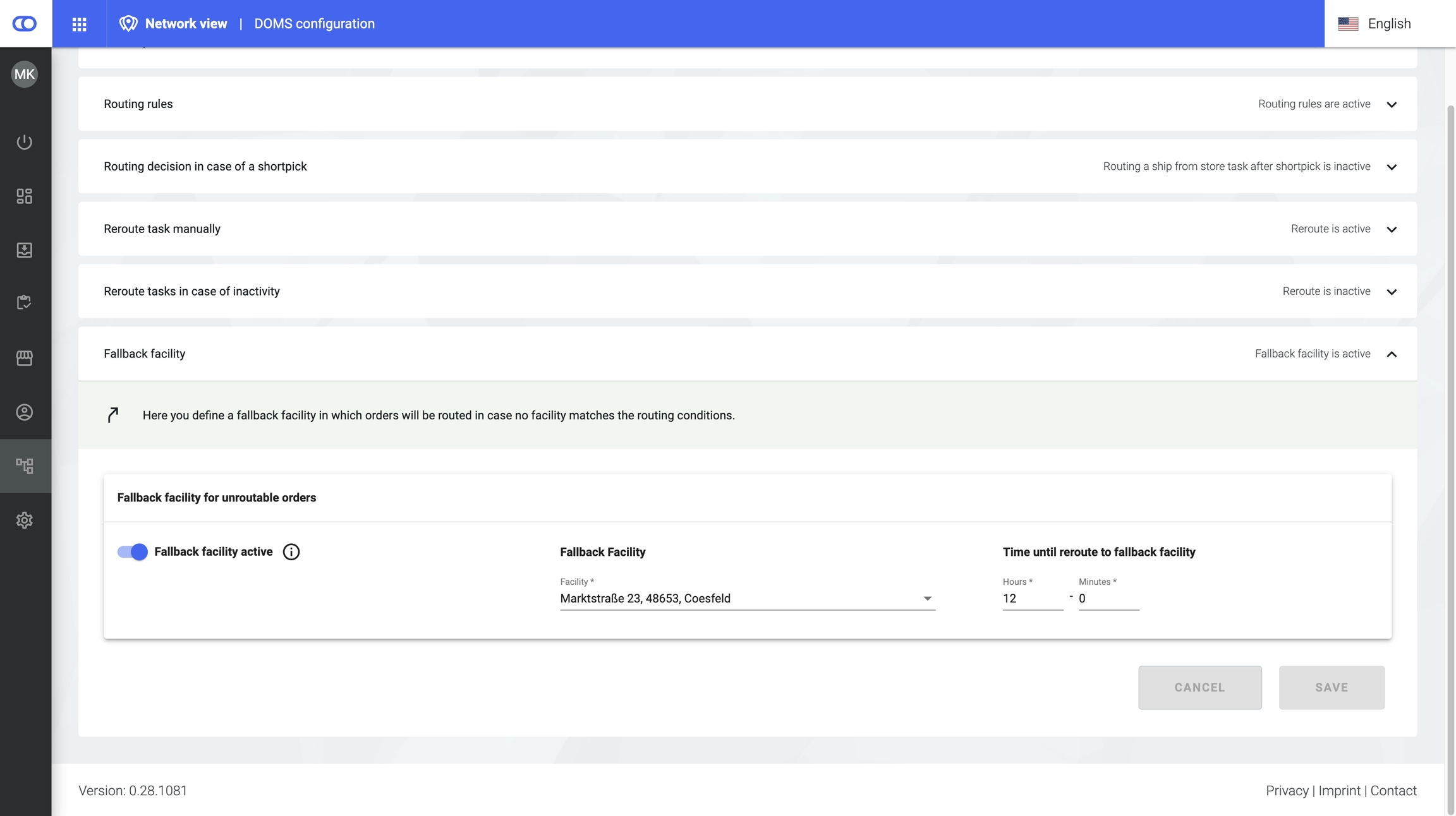 A fallback facility can be defined if the user does not want to perform a manual process in case an order could not be routed. If a fallback facility was defined, orders are assigned to this facility in case they get the state “not_routable”. Such a facility might be a “super-warehouse” which has nearly infinite capacity (or might get a fast replenishment).