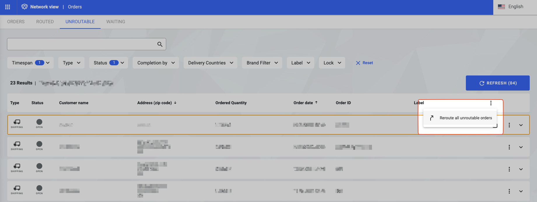 Reroute all unroutable orders triggers the same routing like described above, but all orders are taken into account. You find this feature in the three-dot menu in the header of the table.