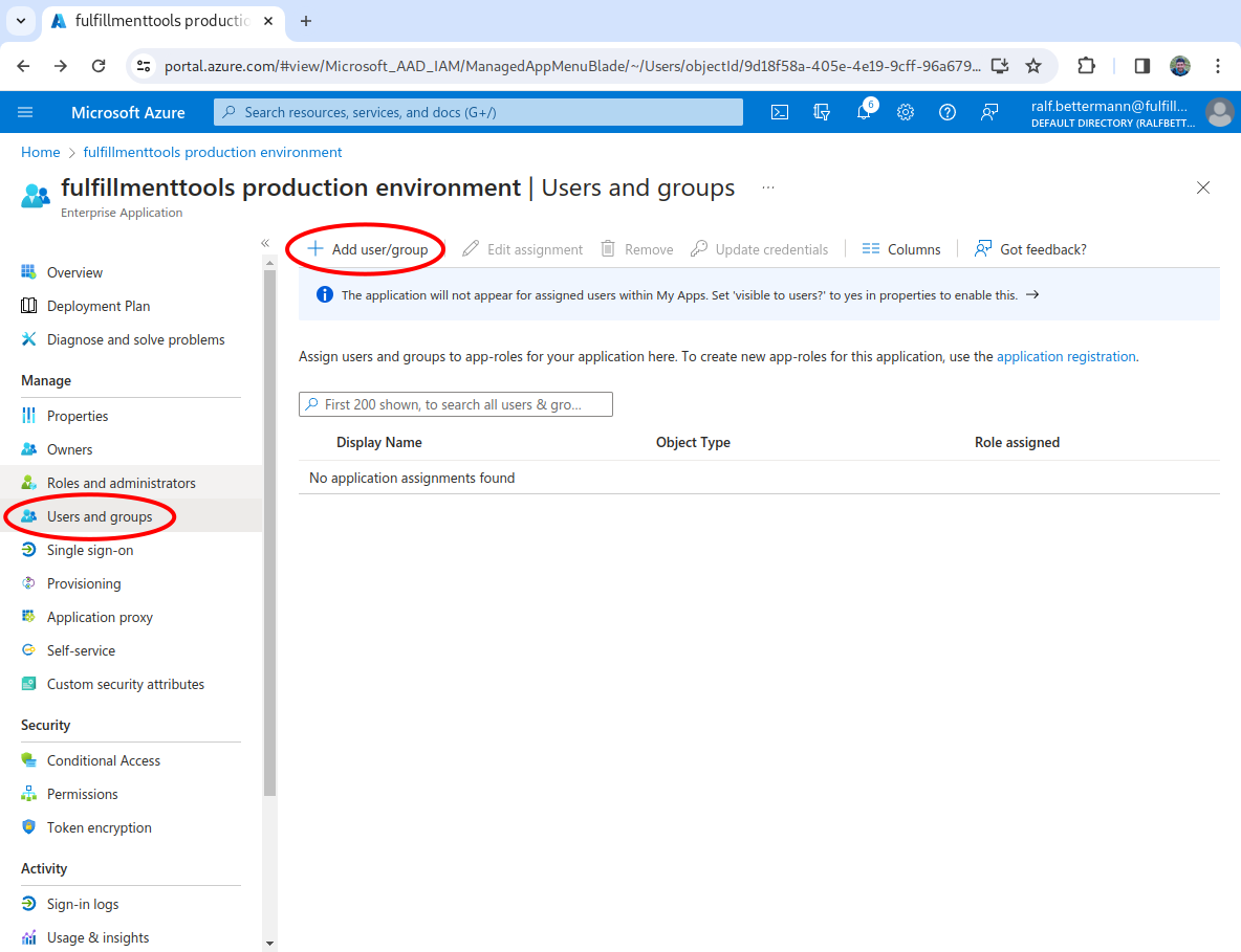 To change the groups assigned to the application, select the application from the Enterprise applications list. Select Users and Groups and then Add user/group. Select the group(s) which should be added to the application from Users and Groups.