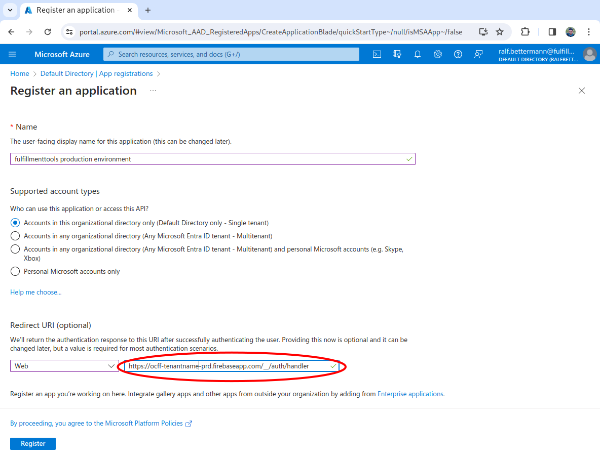 Input a name (for example, fulfillmenttools production environment), leave the supported account types as is, then input a Redirect URI. This has to follow the pattern: https://ocff-<tenantName>-<pre|prd>.firebaseapp.com/__/auth/handler. For example, https://ocff-myproject-prd.firebaseapp.com/__/auth/handler. Then click the Register button.
