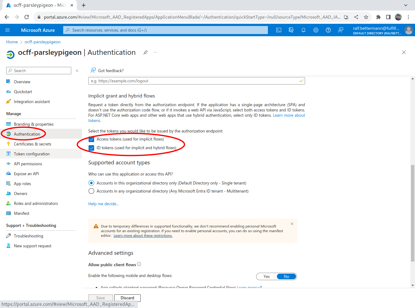 Select Authentication in the left-hand navigation, scroll down the page, and check the check boxes for Access tokens and ID tokens. Then, click Save.
