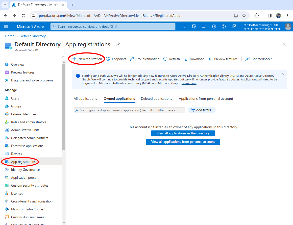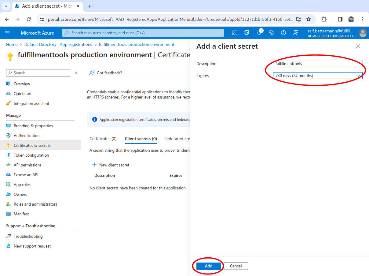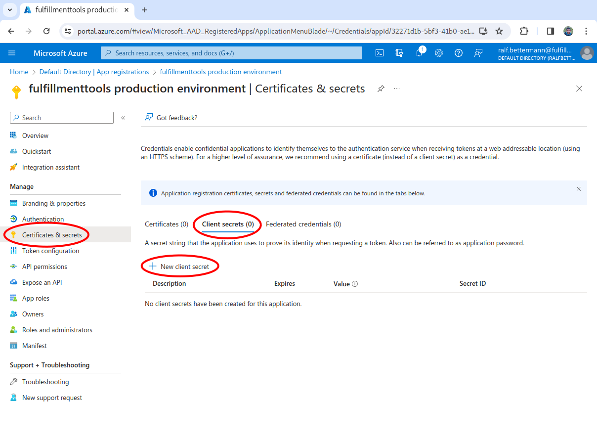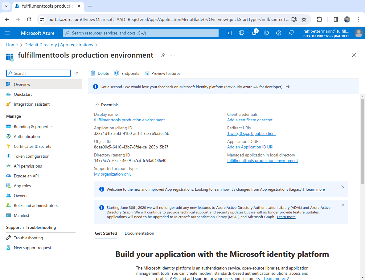 A separate app registration must be created for each fulfillmenttools environment (for example, one for pre-production and one for production).