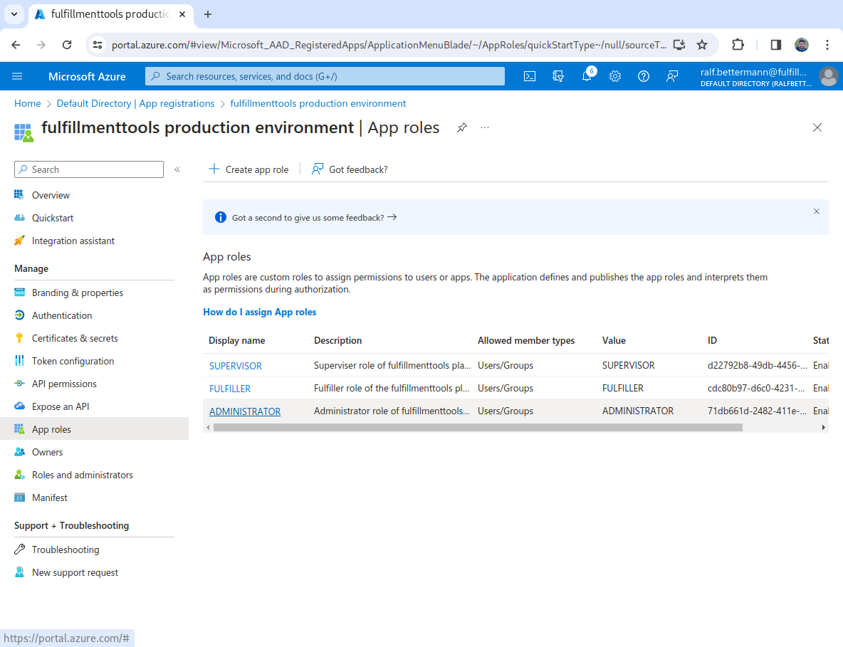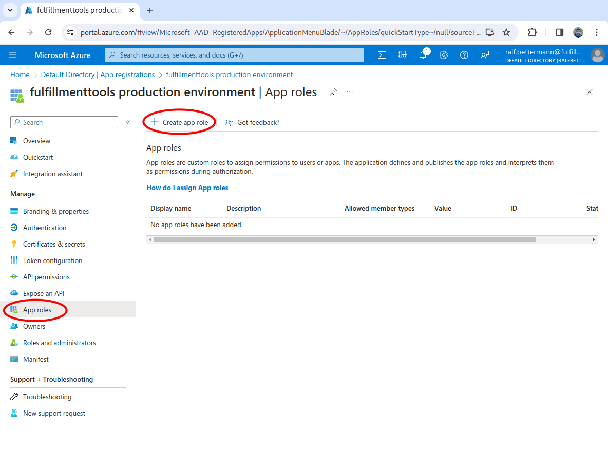 We need to create app roles that correspond to the fulfillmenttools roles. To do this, follow the steps below.
