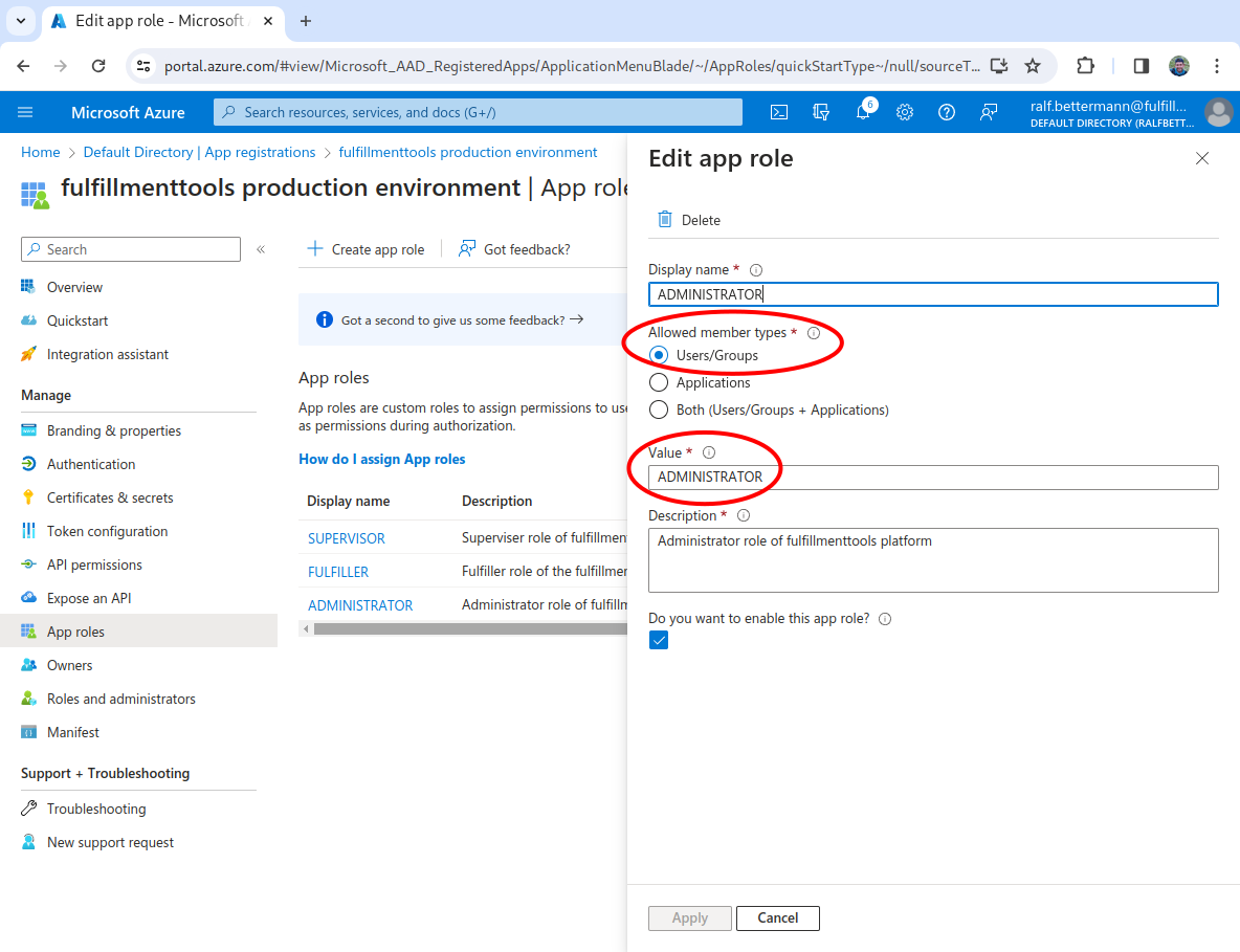 Input the Display name of ADMINISTRATOR, select Users/Groups as the Allowed member types, input a Value of ADMINISTRATOR, input a Description of Administrator role for fulfillmenttools, check the Do you want to enable this app role? check box, then click Save.