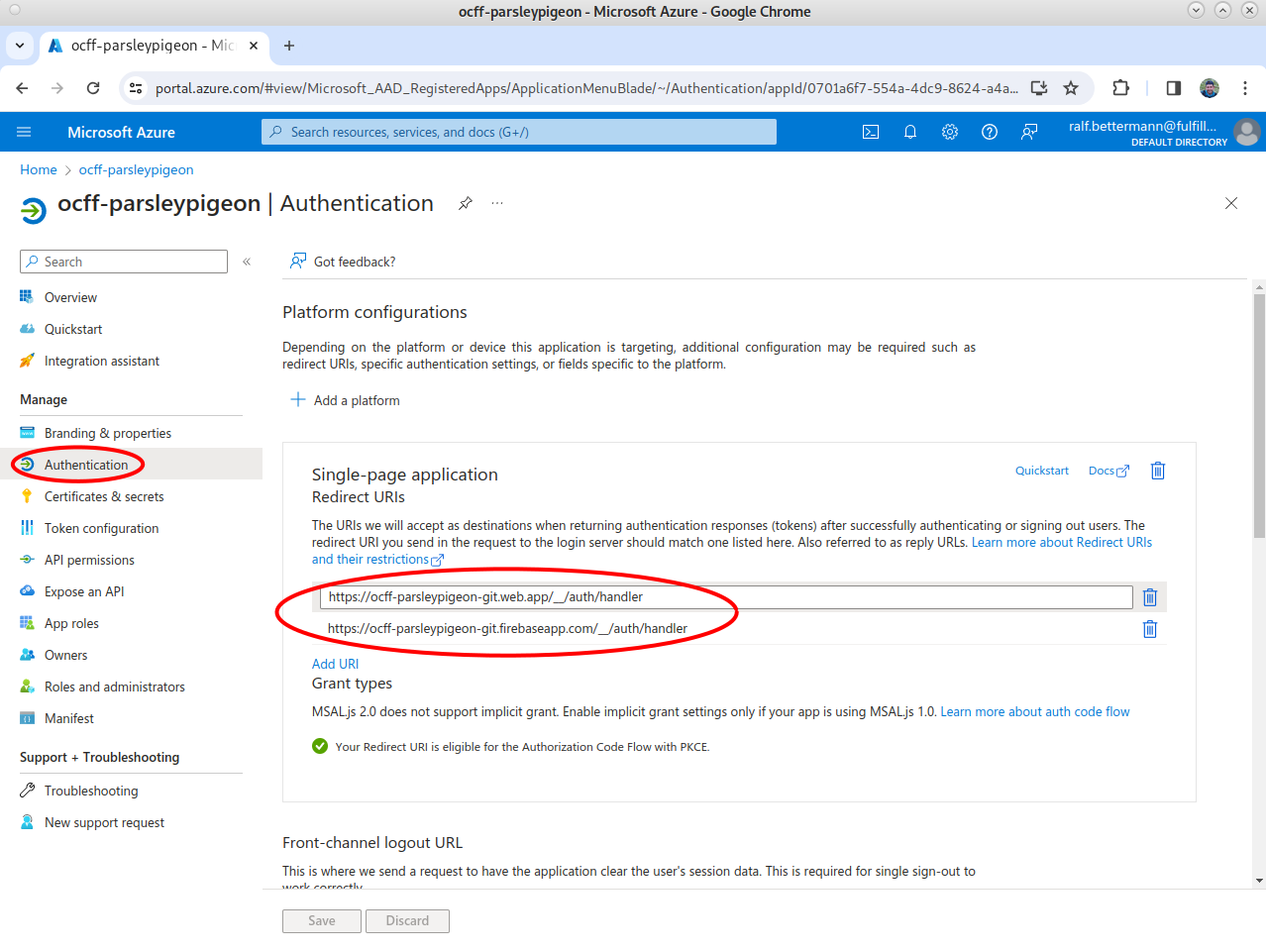 Select Authentication in the left-hand navigation, then select Add URI, and input a second URI. This has to follow the pattern: https://ocff-<tenantName>-<pre|prd>.web.app/__/auth/handler. For example, https://ocff-myproject-prd.web.app/__/auth/handler.