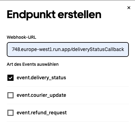 Uber offers a helpful webhook mechanism similar to the subscription pattern in fulfillmenttools. We can establish a connection from Uber towards the created service by creating a webhook for event.delivery_status