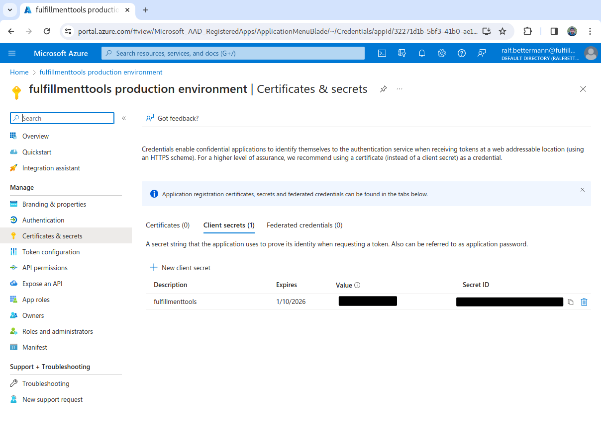 Copy the **Value** and the **Secret ID** and send them to fulfillmenttools.