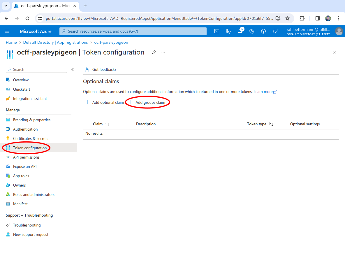 From the App registrations screen, select **Token configuration** from the left-hand navigation and then click the **Add groups claim** button.