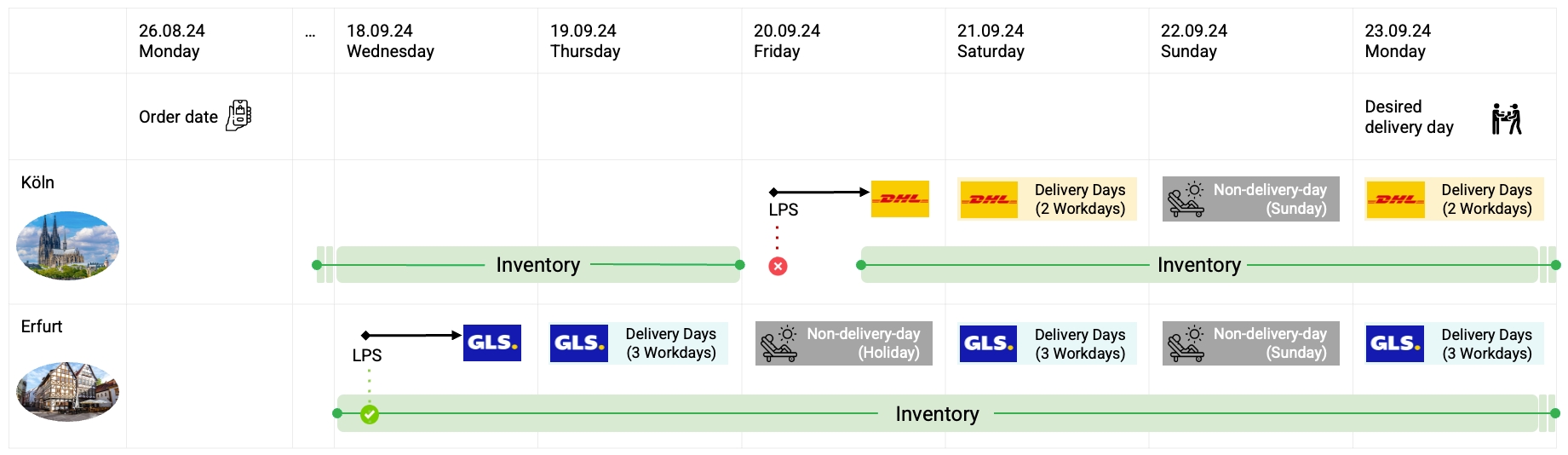 The latest picking start is calculated per facility carrier connection and for potentially possible delivery days. This means that one facility could have multiple latest picking starts. Finally, the LPS with the most available requested stock is chosen.